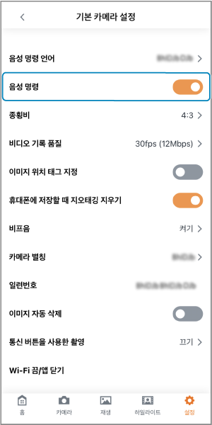 - 앱을 시작한 후 스마트폰 언어 설정을 변경해도 음성 명령의 언어는 변경되지 않습니다. 음성 명령 언어를 변경하려면 [기본 카메라 설정]에서 [음성 명령 언어]를 조정하십시오.