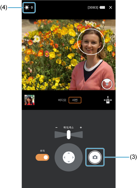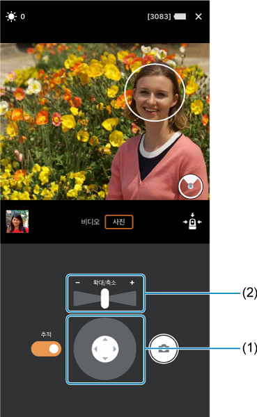 - 줌 컨트롤(2)을 사용하거나 손가락 모으기/벌리기로 피사체 크기를 조정합니다.