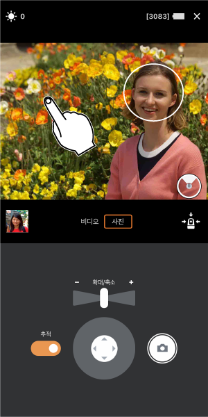 - 카메라가 인물을 감지하면 얼굴 주위에 흰색 원이 표시되고 추적을 시작합니다.