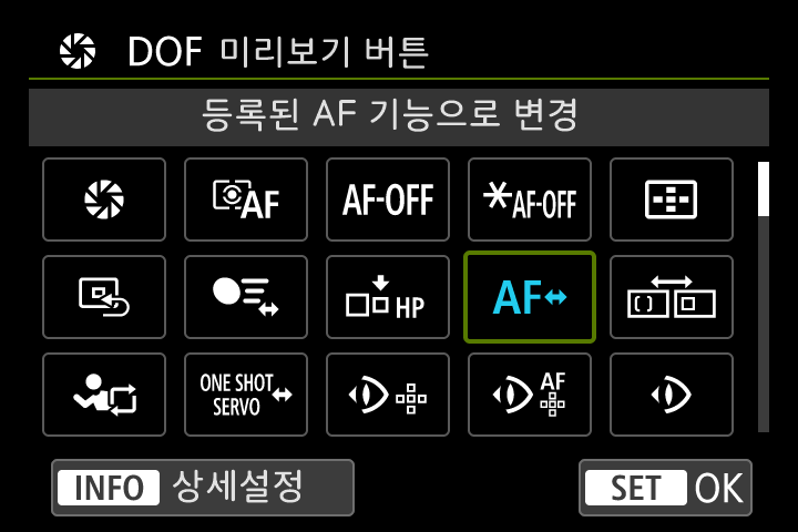 [등록된 AF 기능으로 변경]을 피사계 심도 미리보기 버튼 또는 AF-ON 버튼에 설정하십시오.