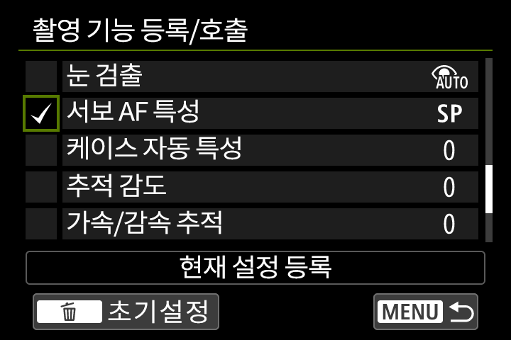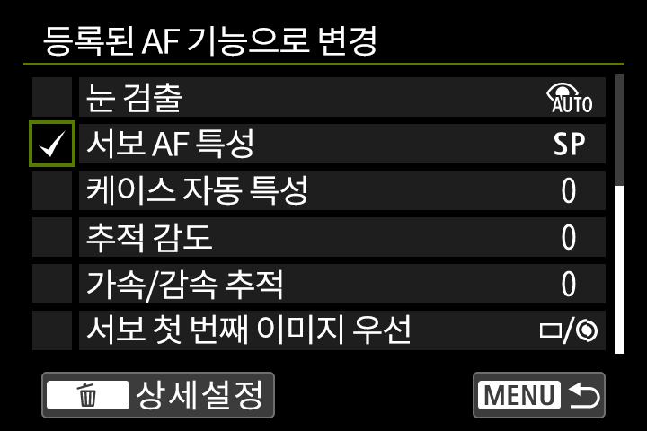 [서보 AF 특성]을 [특수 케이스]로 설정하고 체크박스를 선택하십시오.