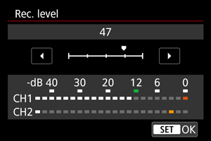 You can adjust the sound-recording level as needed. Adjust the level in [Rec. level].