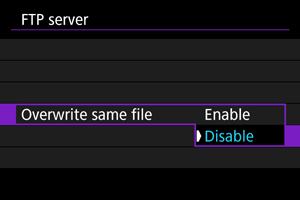 When [Enable] is set and no image is transferred for a certain period, the camera will log off from the FTP server and end the Wi-Fi connection. The connection is re-established automatically when the camera is ready for image transfer again. If you prefer not to end the Wi-Fi connection, set to [Disable].