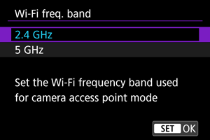 Select the frequency band for camera access point mode, as needed. This frequency band also applies to Wi-Fi connections established using Bluetooth functions.