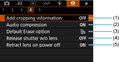 Selecting [: Clear all Custom Func. (C.Fn)] clears all Custom Function settings.