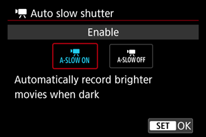 You can choose whether to record movies that are brighter and less affected by image noise than when set to [Disable] by automatically slowing the shutter speed under low light.