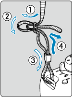 Iš apačios prakiškite dirželio galą pro fotoaparato korpuse esančią kilputę. Tada prakiškite jį pro dirželio sagtį (žr. iliustraciją). Patraukite dirželį ir priveržkite taip, kad jis neatsilaisvintų nuo sagties.