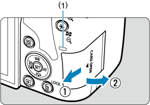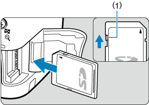 - Kad galėtumėte rašyti ir trinti duomenis įsitikinkite, kad atminties kortelės apsaugos nuo įrašymo jungiklis (1) yra pastumtas aukštyn.