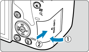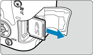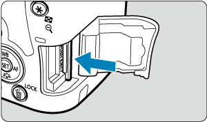 - Kaip parodyta iliustracijoje, atminties kortelę pasukite taip, kad etiketė būtų nukreipta į Jus, ir įkiškite taip, kad spragtelėdama užsifiksuotų.