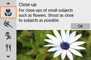 Jei norite stambiu planu fotografuoti gėles ar smulkius objektus, pasinaudokite režimu [] (Stambus planas). Kad maži daiktai atrodytų gerokai didesni, naudokite makroobjektyvą (parduodamas atskirai).