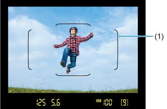 Kai fotografuojate žiūrėdami pro vaizdo ieškiklį, nutaikykite zoninio AF rėmelį (1) į objektą ir nuspauskite iki pusės užrakto mygtuką, kad pradėtų fokusuoti. Automatinio fokusavimo metu fotoaparatas be perstojo tyliai pypsės. Jei sufokusuoti nepavyksta, mirksi fokusuotės indikatorius