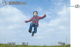 „Live View“ fotografavimo metu zoninio AF rėmelis (2) atsiranda nuspaudus užrakto mygtuką iki pusės. Sufokusavus objektą, AF taškas pasidaro mėlynos spalvos.