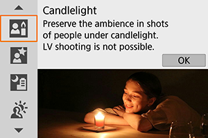 Kai norite nufotografuoti žmogų žvakių šviesoje, naudokite režimą [] (Žvakės šviesa). Žvakių šviesos atmosfera atsispindi nuotraukos atspalviuose.