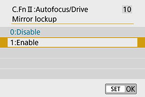 - Nufotografavę, nustatykite parinkties [Mirror lockup/Veidrodžio fiksavimas] nuostatą [0:Disable/0: Išjungti].