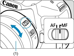 - Sukite objektyvo fokusavimo žiedą (1) iki vaizdo ieškiklyje objektas pasidarys ryškus.