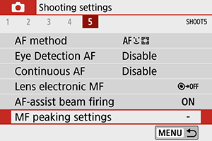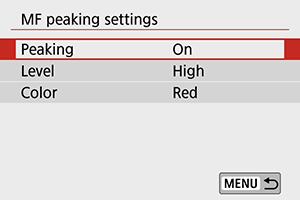 - MF maksimizavimą gali būti sunku įžiūrėti, kai naudojamas didelis ISO jautrumas, ypač, kai nustatytas ISO išplėtimas. Jei būtina, nustatykite mažesnį ISO jautrumą arba nustatykite parinkties [Peaking/Maksimizavimas] nuostatą [Off/Išjungti].