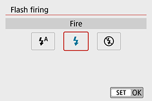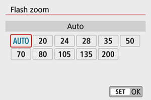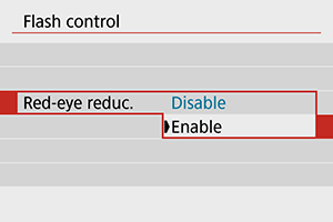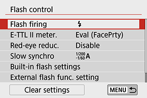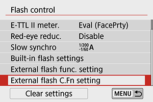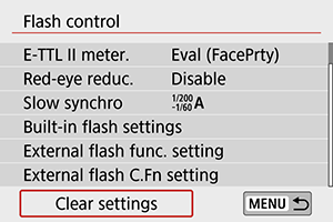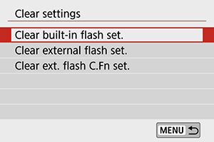 Pasirinkite [Clear built-in flash set./Išvalyti įmontuotos blykstės nuostatas], [Clear external flash set./Išvalyti išorinės blykstės nuostatas] arba [Clear ext. flash C.Fn set./Išvalyti išorinės blykstės pasirenkamų funkcijų nuostatas].