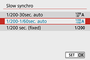 norite naudoti lėtą sinchronizavimą, nustatykite nuostatą [1/200-30sec. auto / 1/200–30 sek. autom.].