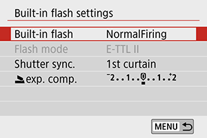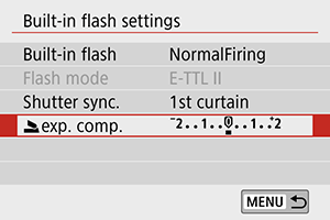 Įmontuotos blykstės arba išorinių EL/EX serijos „Speedlite“ blyksčių nuostatas galima nustatyti naudojantis fotoaparato meniu ekranais.