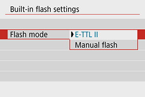 Nustatykite nuostatą [E-TTL II], jei norite fotografuoti visiškai automatiniu blykstės režimu E-TTL II / E-TTL. Kad įjungtumėte [Flash mode/Blykstės režimas], pasirinkite [CustWireless/Pasirinktina belaidė] dalyje [Built-in flash/Įmontuota blykstė].