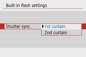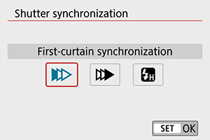 - Naudodamiesi antrosios užuolaidėlės sinchronizacija nustatykite 1/80 s arba ilgesnį išlaikymą. Pasirinkus 1/80 s arba trumpesnį išlaikymą, automatiškai taikomas pirmos užuolaidėlės sinchronizavimas, net jei nustatyta nuostata [Second-curtain synchronization/II užuolaidėlės sinchronizavimas].