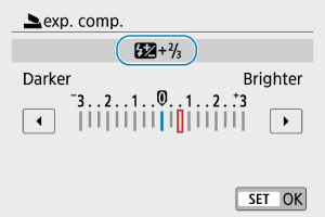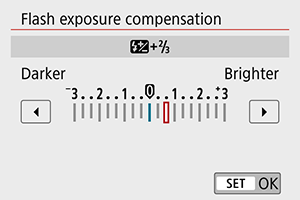 - Jei „Speedlite“ blykste nustatytas ekspozicijos kompensavimas fotografuojant su blykste, fotoaparatu šios funkcijos nustatyti nebegalima. Atminkite, kad „Speedlite“ blykstės nuostatai teikiama pirmenybė, jei vienu metu nustatyta ir fotoaparatu, ir blykste.