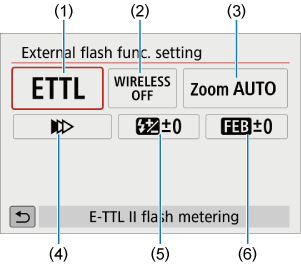 Rodoma informacija, rodinio padėtis ir galimos parinktys priklauso „Speedlite“ blykstės modelio, jos pasirenkamų funkcijų nuostatų, blykstės režimo ir kitų faktorių. Informacijos apie blykstės funkcijas žr. blykstės naudotojo vadove.