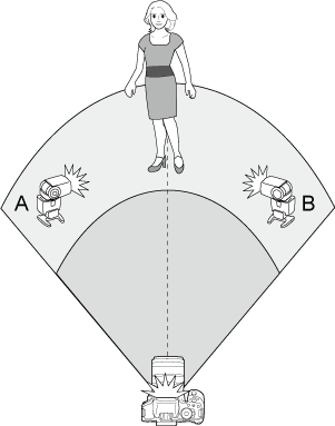 Vadovaudamiesi instrukcijomis, pateiktomis blykstės naudotojo vadove, dalį imtuvų priskirkite suveikimo grupei A, kitas – suveikimo grupei B ir išdėstykite kaip pavaizduota.
