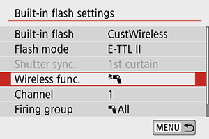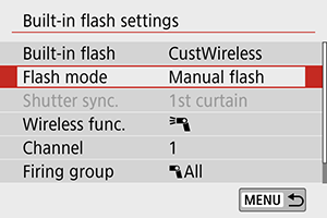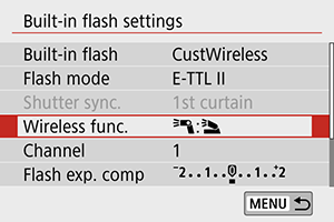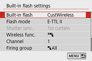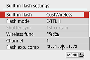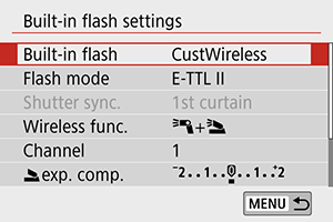 Pasirinkite parinkties [Built-in flash/Įmontuota blykstė] nuostatą [CustWireless/Pasirinktinė belaidė].