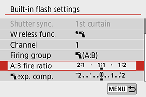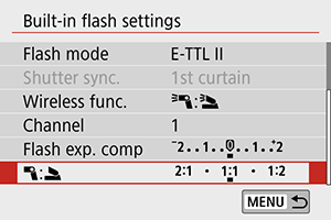Pasirinkite [Built-in flash settings/Įmontuotos blykstės nuostatos].