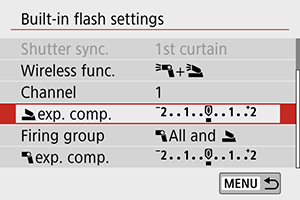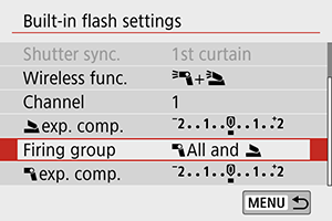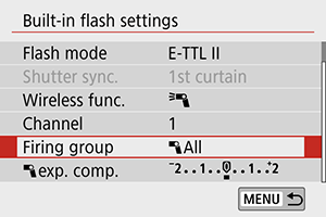 Galima rinktis, kai nustatyta parinkties [Flash mode/Blykstės režimas] nuostata [E-TTL II]. Atminkite, kad galimos ekspozicijos kompensavimo fotografuojant su blykste nuostatos (žr. žemiau) priklauso nuo [Wireless func./Belaidžio valdymo funkcija] ir [Firing group/Suveikimo grupė] nuostatų.