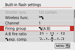 Pagrindinės nuostatos tokios, kaip nurodyta toliau. Derindami parinkties [Firing group/Suveikimo grupė] nuostatas galite nustatyti įvairius fotografavimo su belaide blykste būdus, kai naudojama ir įmontuota blykstė.