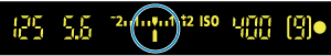 - Kai užrakto mygtuką nuspausite iki pusės, vaizdo ieškiklyje atsiras AEB diapazonas.