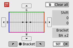 , atšaukiamos parametro [WB Shift/Bkt./Baltos spalvos balanso poslinkis / skirtingų parametrų baltos spalvos balanso serija] nuostatos.