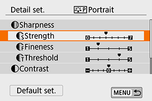 - Jei atlikdami 3 veiksmą pasirinksite [Default set./Numatytoji nuostata], atkursite numatytąsias atitinkamos „Picture Style“ sąrankos parametrų nuostatas.