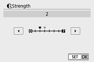 2: Nustatoma, kiek paryškinamas kontūras remiantis kontrasto skirtumu tarp objekto ir aplinkos. Kuo mažesnis skaičius, tuo labiau pabrėžiamas kontūras, kai kontrasto skirtumas nedidelis. Tačiau kai skaičius mažesnis, labiau pastebimi iškraipymai.