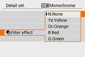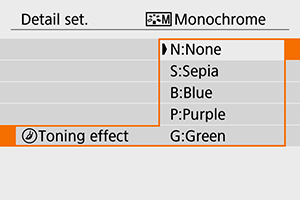 Galite tinkinti bet kurią „Picture Style“ sąranką pakeisdami numatytąsias nuostatas. Išsamios informacijos apie parinkties [Monochrome/Vienspalvis] tinkinimą rasite [] Vienspalvės sąrankos reguliavimas.