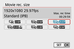 :Įrašomos filmuotos medžiagos dydis] galite nustatyti vaizdo dydį, kadrų dažnį ir glaudinimo metodą. Filmas bus įrašytas kaip MP4 failas.