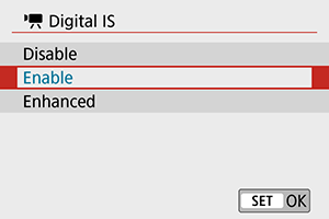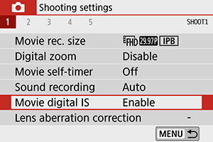 - Naudojant TS-E objektyvą, žuvies akies „fish-eye“ objektyvą arba ne „Canon“ gamybos objektyvą, rekomenduojama nustatyti filmų skaitmeninio stabilizavimo funkcijos nuostatą [Disable/Išjungti].