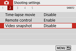 - Nustatykite parinkties [Video snapshot/„Video snapshot“] nuostatą [Disable/Išjungti]. Jei norite filmuoti įprastai, būtinai nustatykite nuostatą [Disable/Išjungti].