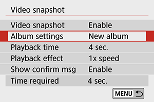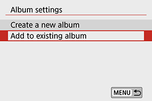 - Atlikdami 3 veiksmą, nurodytą „Video Snapshot“ klipų nuostatų konfigūravimas, pasirinkite [Add to existing album/Įtraukti į esamą albumą].