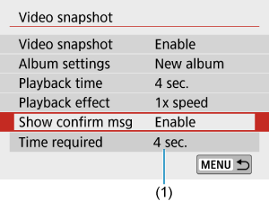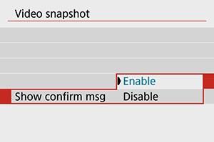 - Jei pageidaujate iškart filmuoti kitą „Video snapshot“ klipą, nustatykite parinkties [Show confirm msg/Rodyti patvirtinimo pranešimą] (dalyje [