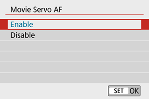 Perspėjimai pasirinkus [Movie Servo AF] nuostatą [Enable/Įjungti].
