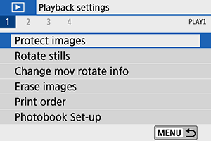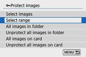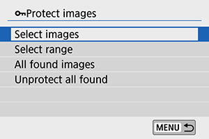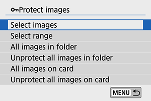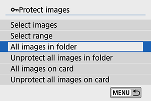 - Norėdami atšaukti pasirinktus vaizdus, pasirinkite [Unprotect all images in folder/Atšaukti visų aplanke esančių vaizdų apsaugą] arba [Unprotect all images on card/Atšaukti visų kortelėje esančių vaizdų apsaugą].