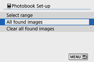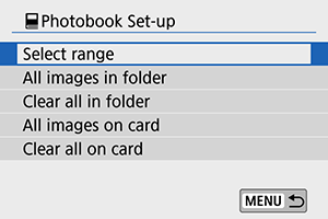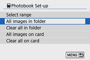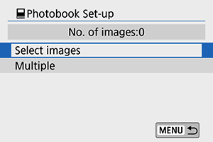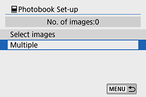 :Fotoknygos sąranka] galite nustatyti parinkties [Multiple/Keli] nuostatą [All images in folder/Visi vaizdai aplanke] arba [All images on card/Visi vaizdai kortelėje], kad fotoknygai spausdinti būtų nurodyti visi aplanke arba kortelėje esantys vaizdai.