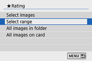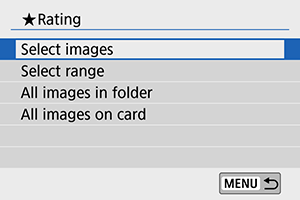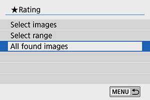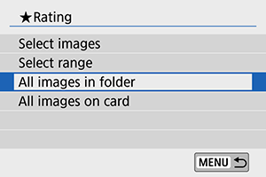 :Vertinimas] pasirinkus nuostatą [All images in folder/Visi vaizdai aplanke] arba [All images on card/Visi vaizdai kortelėje], bus įvertinti visi aplanke arba kortelėje esantys vaizdai.