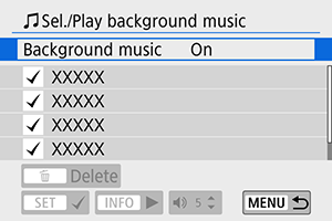 - Jei norite leisti foninę muziką, pasinaudokite parinktimi [Background music/Foninė muzika], kad galėtumėte pasirinkti muziką ().