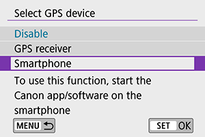 Vaizdus galite pažymėti geografinėmis žymėmis naudodamiesi GPS imtuvu GP-E2 (parduodamas atskirai) arba išmaniuoju telefonu, kuriame įjungtas „Bluetooth“ ryšys.