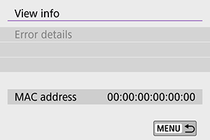 Galite patikrinti informaciją apie klaidą ir fotoaparato MAC adresą.