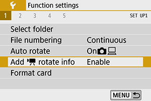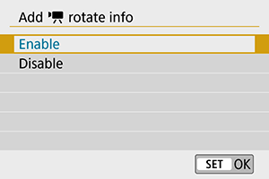 Jei filmai įrašomi laikant fotoaparatą vertikaliai, galima automatiškai pridėti orientacijos informaciją, nurodančią, kuri pusė turi būti viršuje, kad peržiūra tokia pačia orientacija būtų įjungta ir išmaniuosiuose telefonuose ar kituose įrenginiuose.